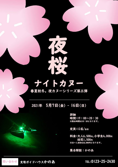 支笏ガイドハウスかのあ2021年春の新プログラム「夜桜ナイトカヌー」。
