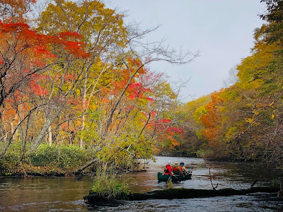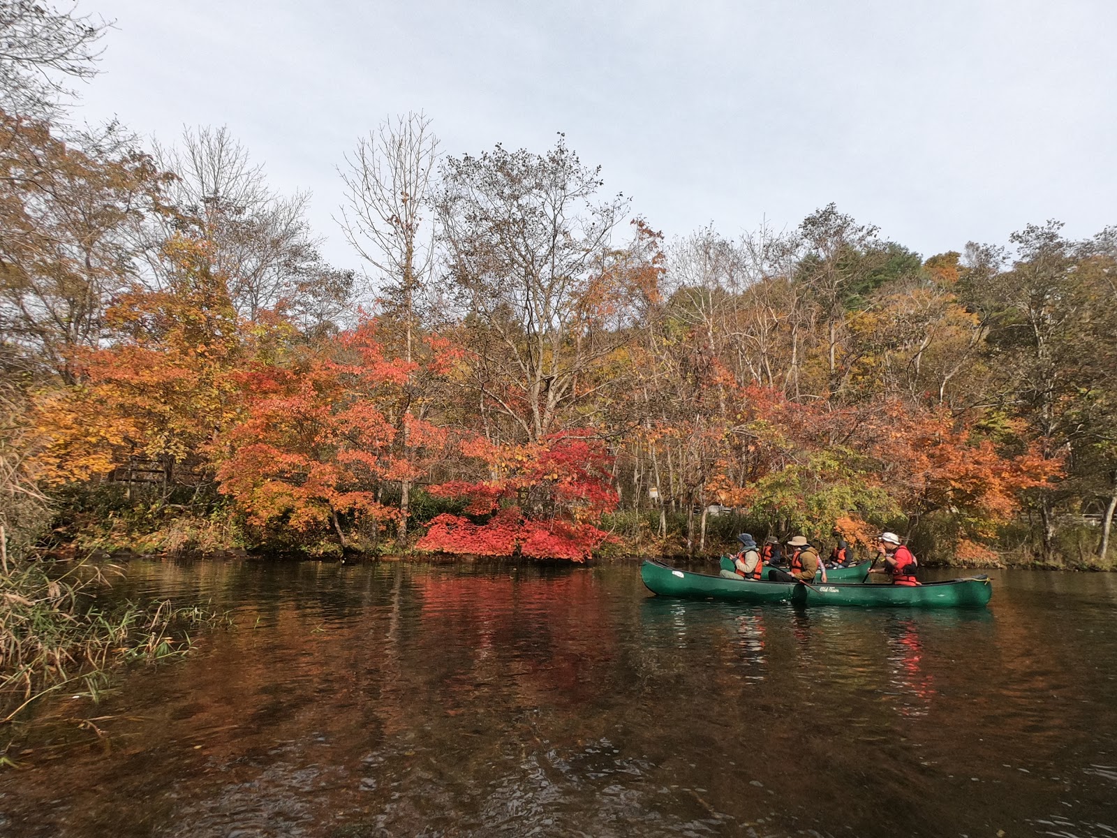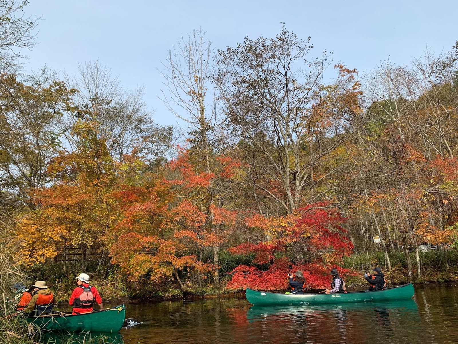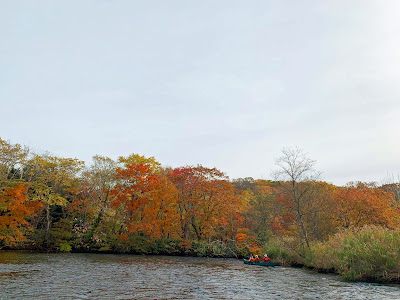 支笏湖の紅葉は黄色が多く、千歳川は赤が多い。