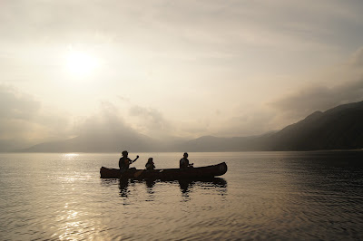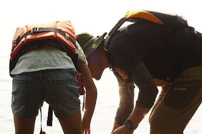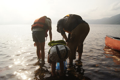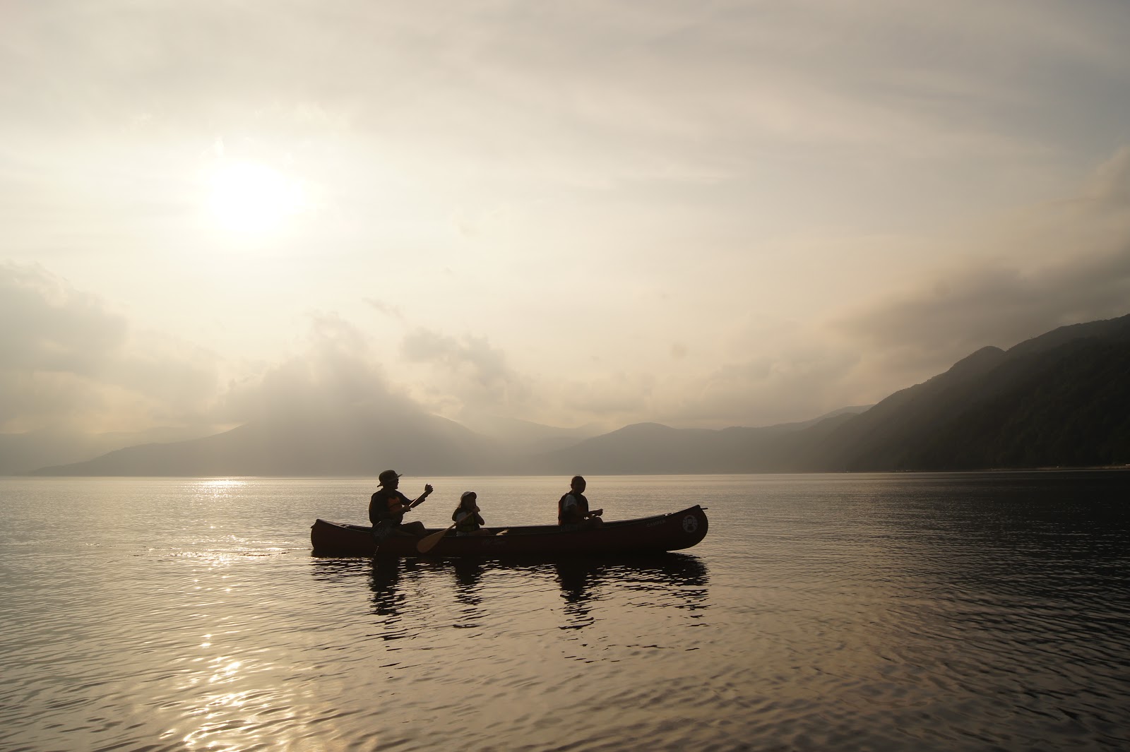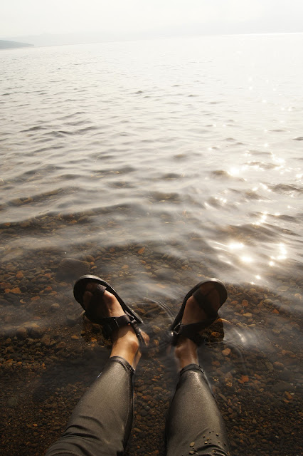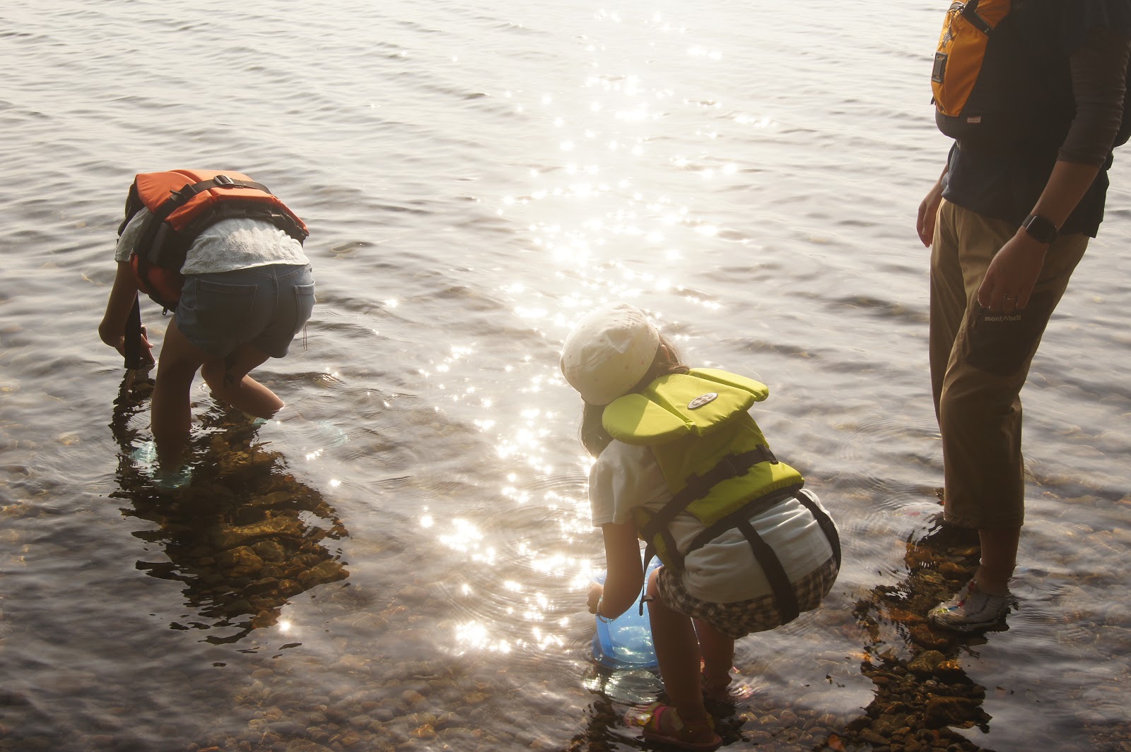 私は砂地の湖畔におしりまで水に浸かり夕日を眺め