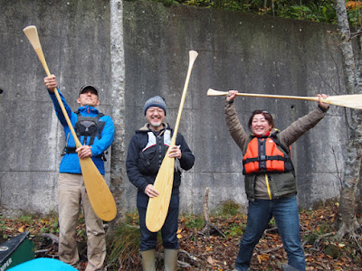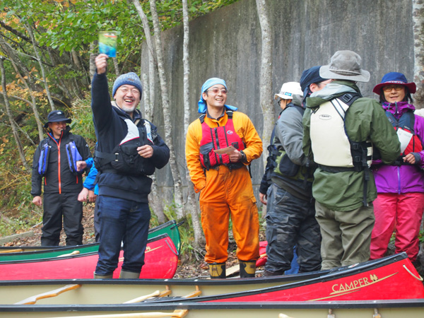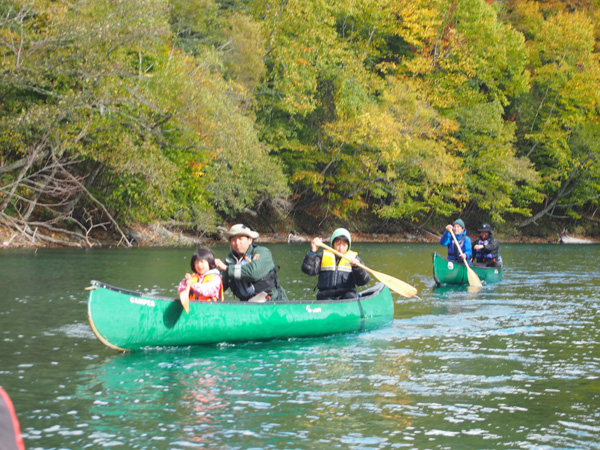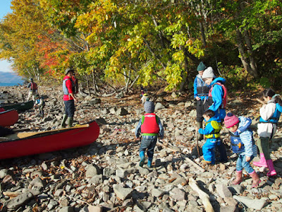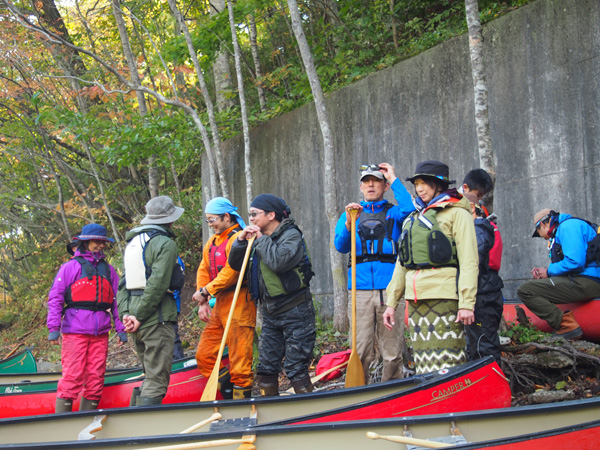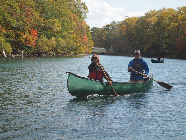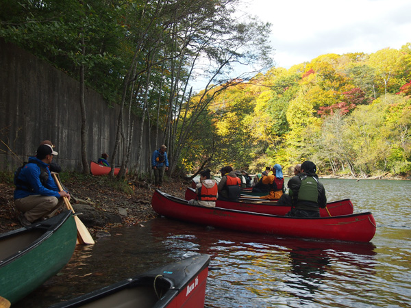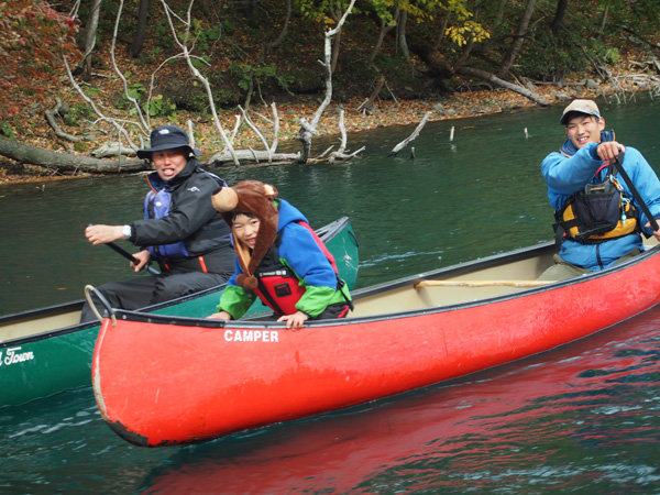 初日は風も穏やかで美しい紅葉を横目にカヌー。