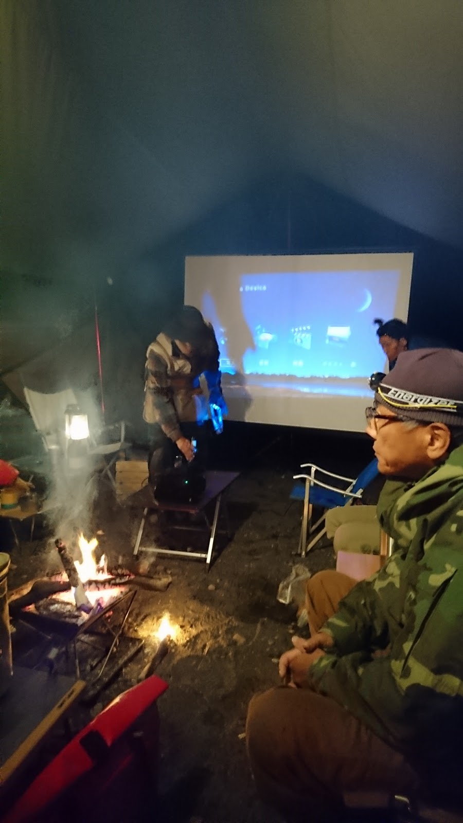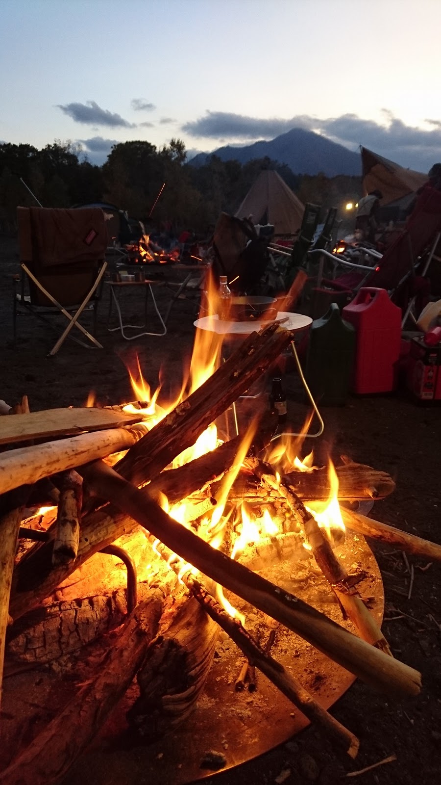 陽は傾きどんどん暗くなり、焚火の明るさと暖かさがいい感じ。