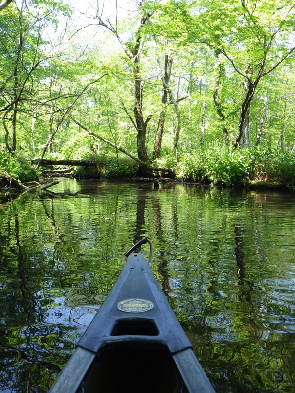 緑色の木々の合間を歩くより速いスピードで進むカヌー。