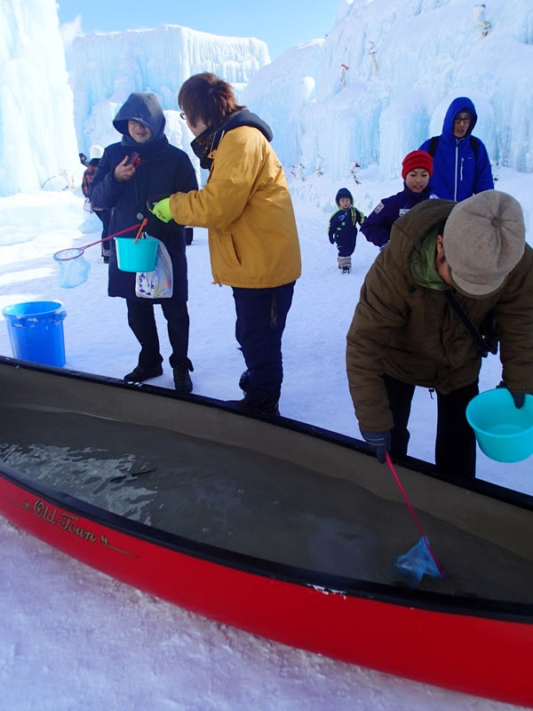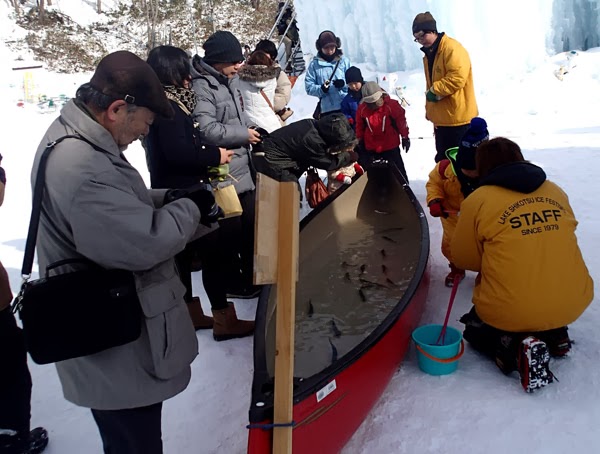 ①金魚すくいのようにカヌーに放したヒメマスをすくっていただく