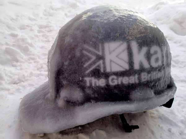 夜は夜で雨具は凍り、ヘルメットもこの通り・・・。