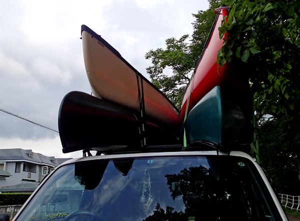 オリーブ・サンド・レッド・グリーンと色とりどりのカヌーを積んで