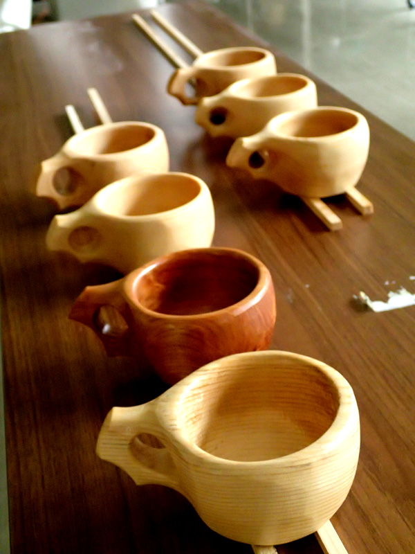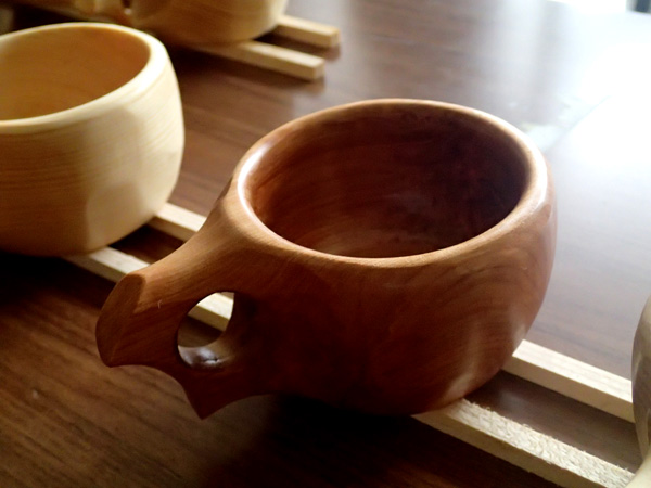 大小、素材様々なカップが並びます。