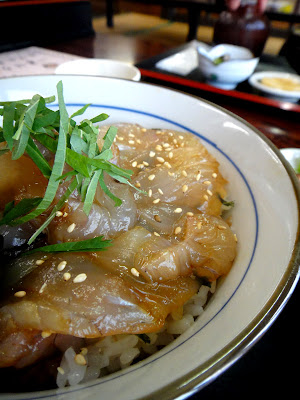 十二湖を後にすると「ヒラメのヅケ丼」キャラクターなるものを発見。