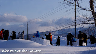 ちょうど雪のブロックを積み重ねて作る「イグルー作り」の体験を行なっている所で