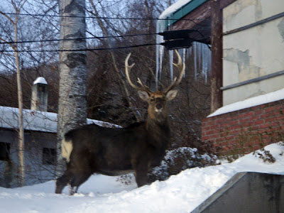 支笏湖の郵便局前に堂々と立ちすくむエゾシカを見ながら出勤。