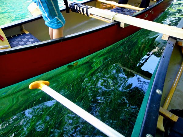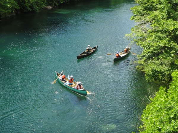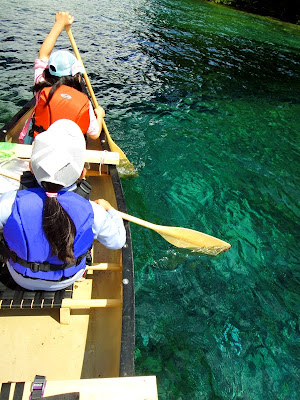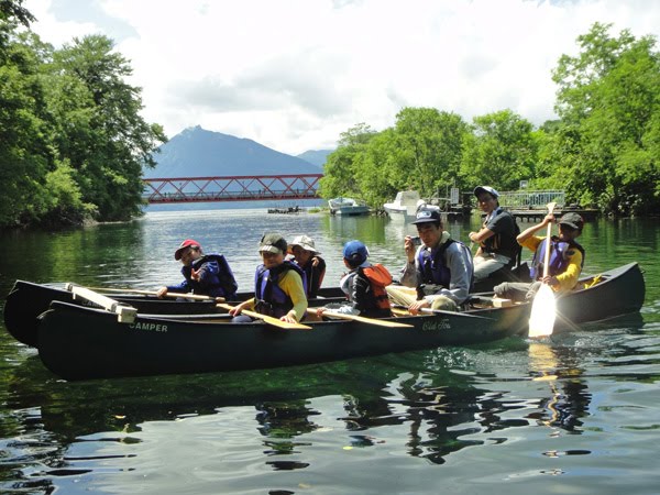 7人~8人乗りの2艇つなぎカヌーはいい具合に光の反射を抑え、