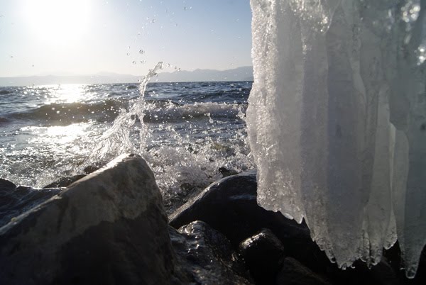 カメラを持って湖畔で波を待つ。