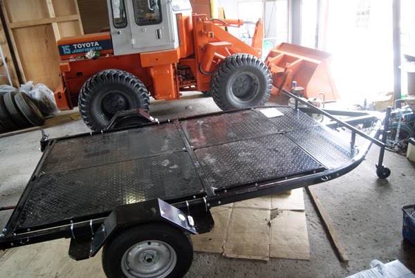 千歳市内の車屋さんで「かのあ」のカヌートレーラーが着々と組み立てられています。
