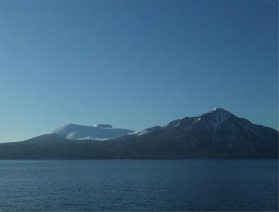 久しぶりに全く波のない支笏を見ました。青空に青い水。雪をかぶった左側「樽前山」優しい感じと右側「風不死岳」ゴツゴツした感じ。