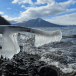 氷点下で風が強く波が凍っていくしぶき氷。